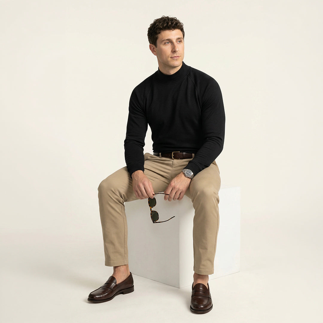 Most ribbed necklines stretch out after a few wears and never recover. The Hi-Neck's ribbed collar is engineered to keep its structure - sitting close without pulling, looking clean without stiffening. Wear it once. Wear it a hundred times. It looks the same.